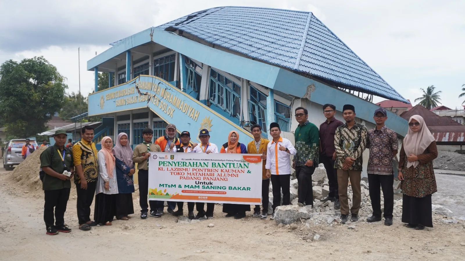Tim gabungan dari Pesantren Kauman dan KL Lazismu Pesantren Kauman memulai penyaluran dengan menyerahkan bantuan kepada keluarga besar MTs Muhammadiyah Saniang Baka. Tidak hanya bahan pokok, tim juga memberikan makanan siap santap untuk makan siang para guru sebagai bentuk perhatian dan penghargaan atas dedikasi mereka di tengah musibah.