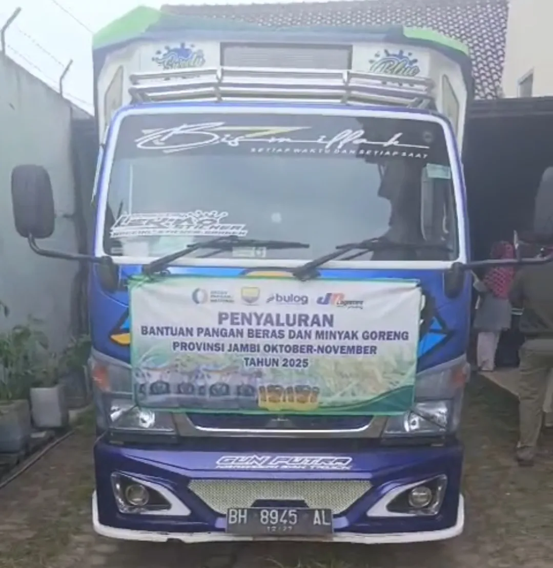 Anehnya, truk pengangkut minyak goreng tersebut terdapat spanduk bertuliskan “Penyaluran Bantuan Pangan Beras dan Minyak Goreng Provinsi Jambi Oktober-November Tahun 2025.”