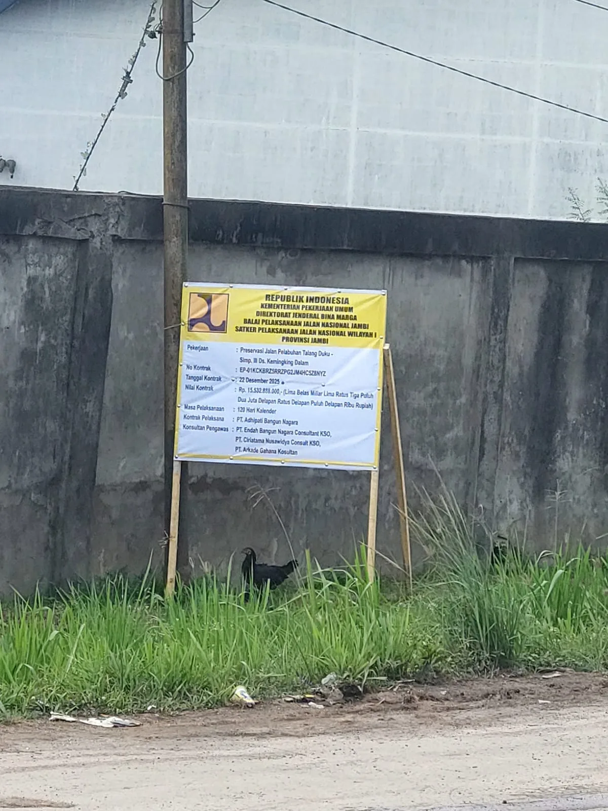 Jambi – Proyek pembangunan Inpres Jalan Daerah (IJD) Talang Dulu–Simpang III Desa Kemingking senilai Rp15 miliar yang dikerjakan PT Adhipati Bangun Nagara di bawah Satker Wilayah I BPJN IV Jambi menuai sorotan tajam.